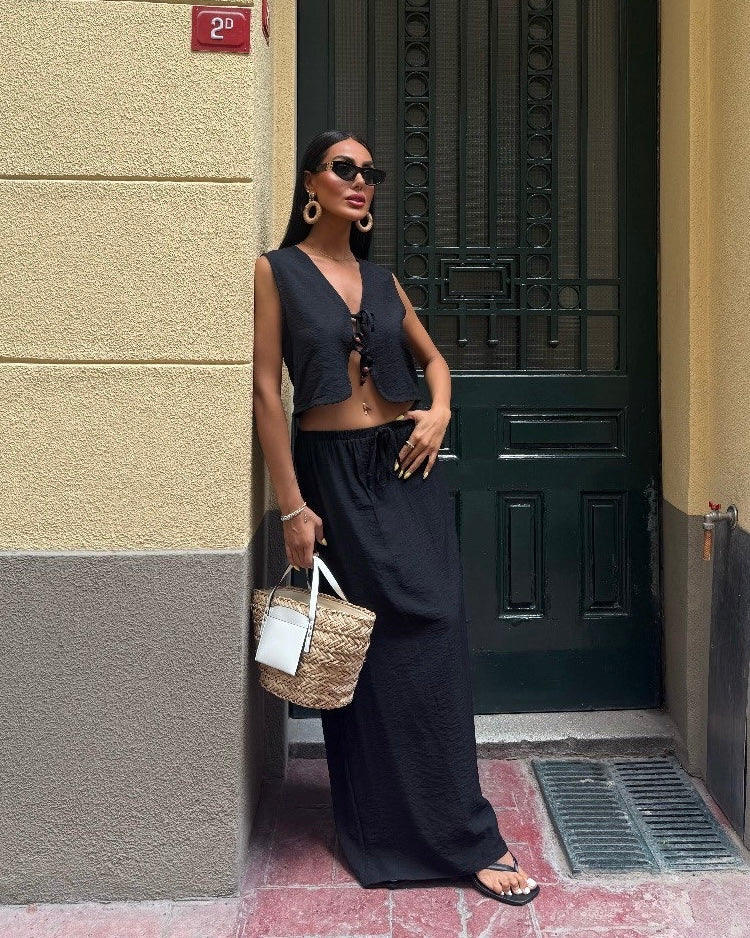 طقم أنيق يتكوّن من قطعتين بلون أسود كلاسيكي بلمسة عصرية وهادئة. التوب بدون أكمام بتصميم ياقة V عميقة وأربطة أمامية مزينة بحبات خشبية صغيرة، تضيف لمسة بوهيمية ناعمة للتفاصيل.و تنورة طويلة بخصر مطاطي مع رباط خفيف في المنتصف،تمنح الطقم راحة وأناقة في نفس الوقت.