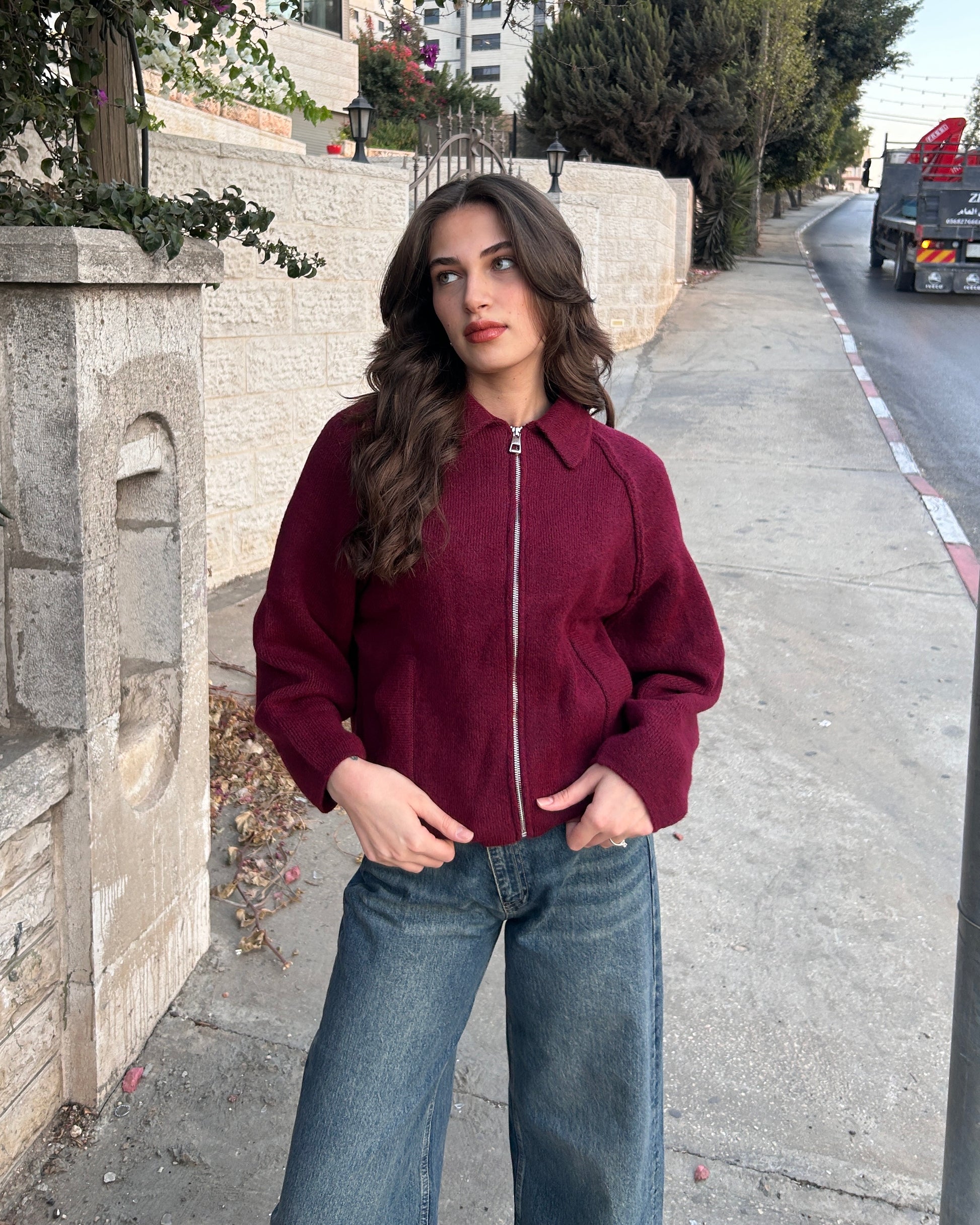 Burgundy Zip-Up Cozy Sweater | سويتر دافئة بسحّاب أمامي باللون الخمري