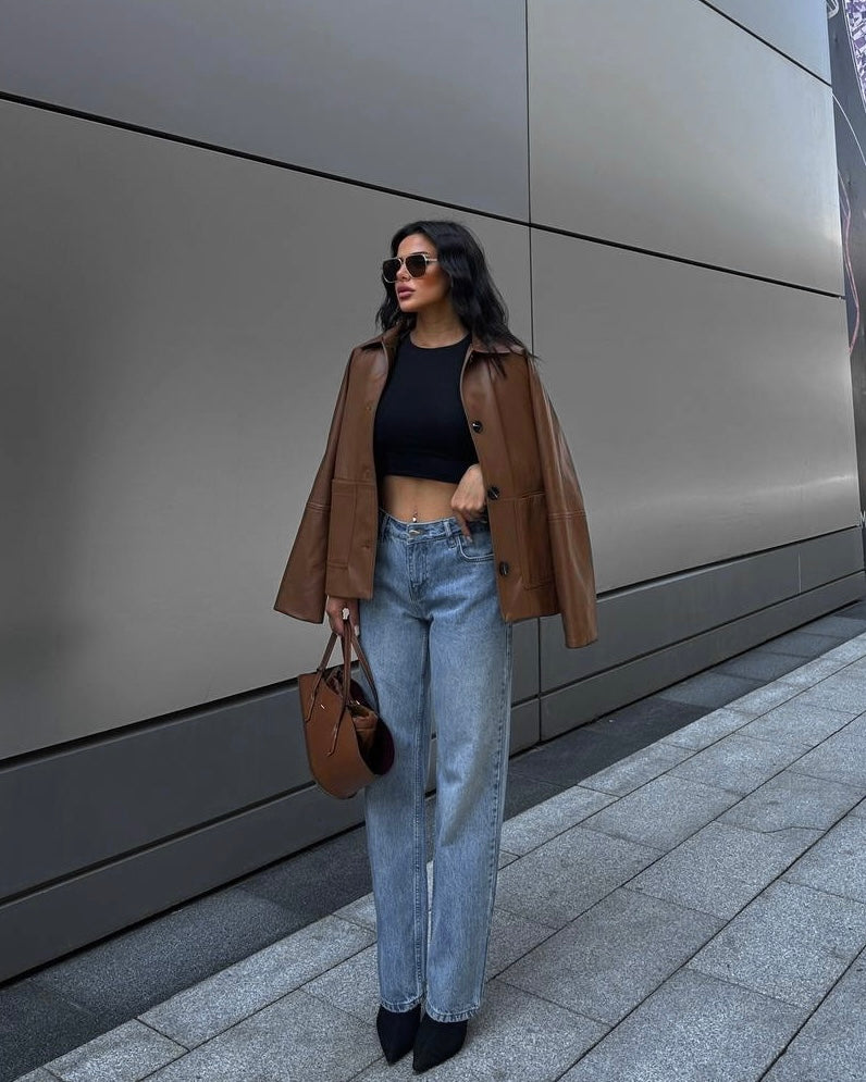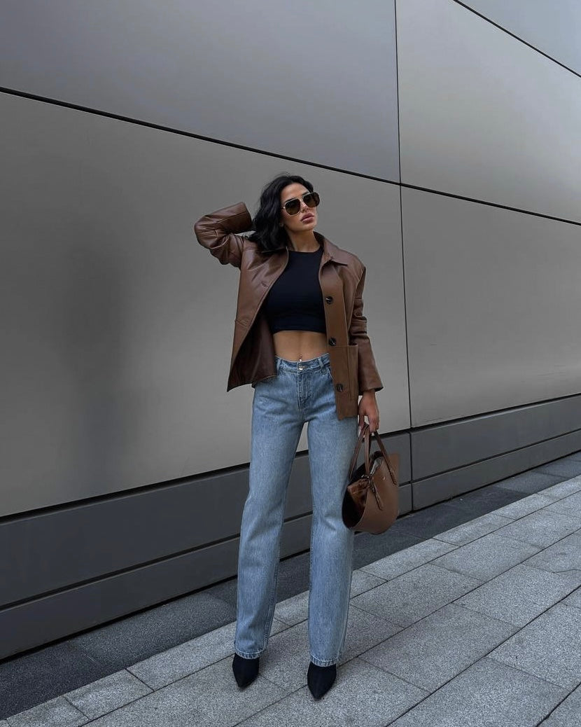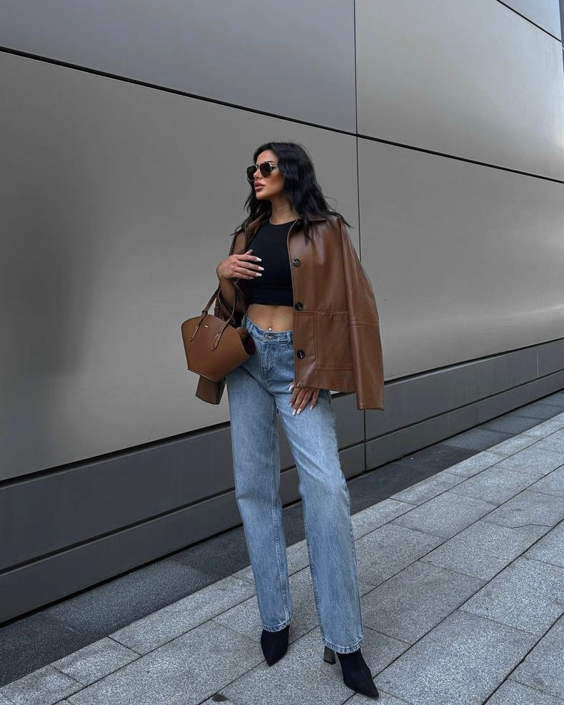 جاكيت كلاسيكي من الجلد البني يتميز بأزرار أمامية كبيرة تضفي عليه لمسة مميزة