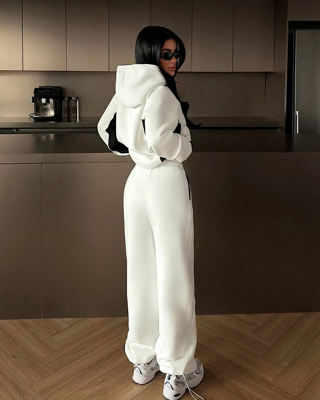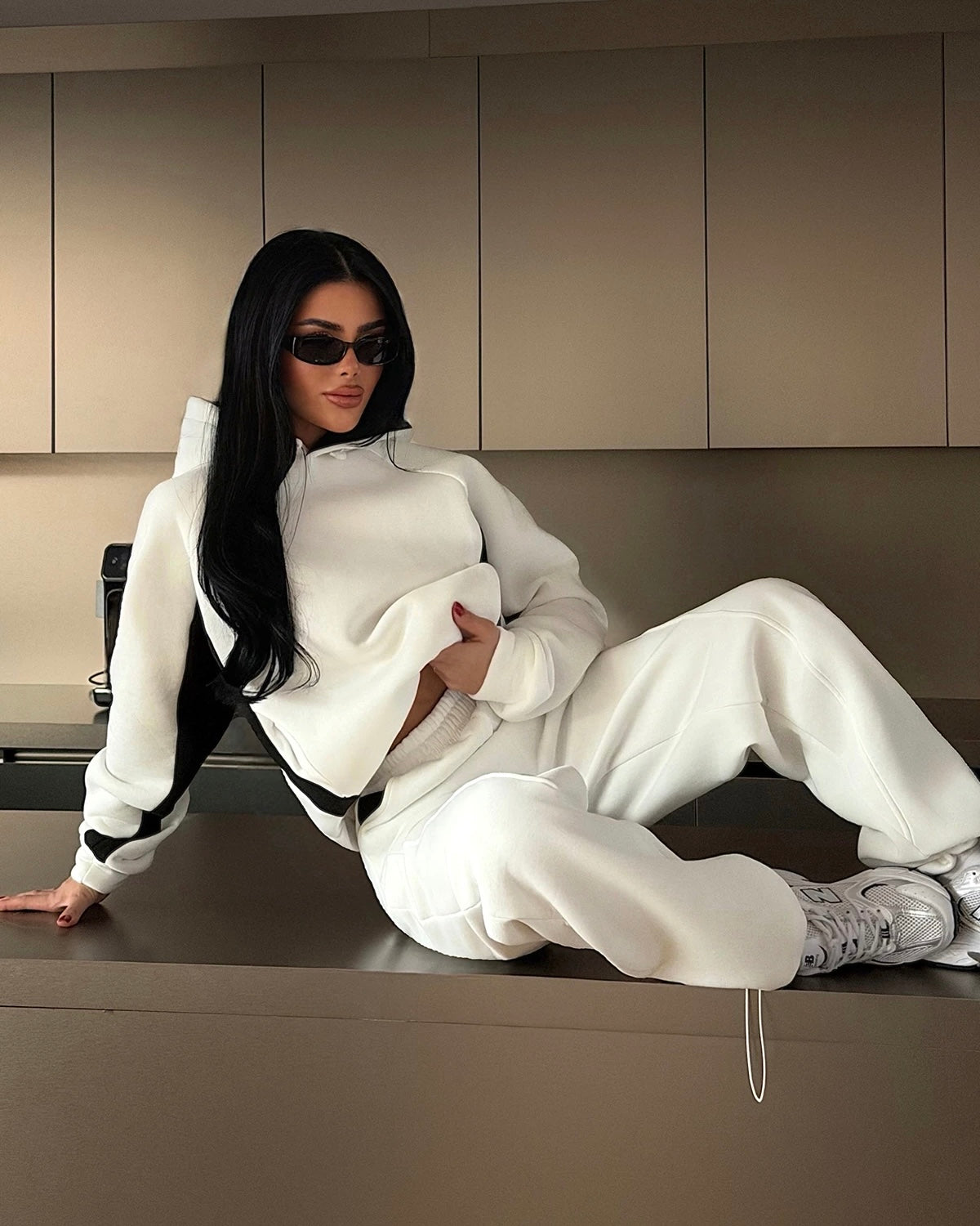 طقم باللونين الأسود والأبيض، مصمم ليجمع بين الراحة اليومية. بلون أبيض نقي مع تفاصيل سوداء متباينة