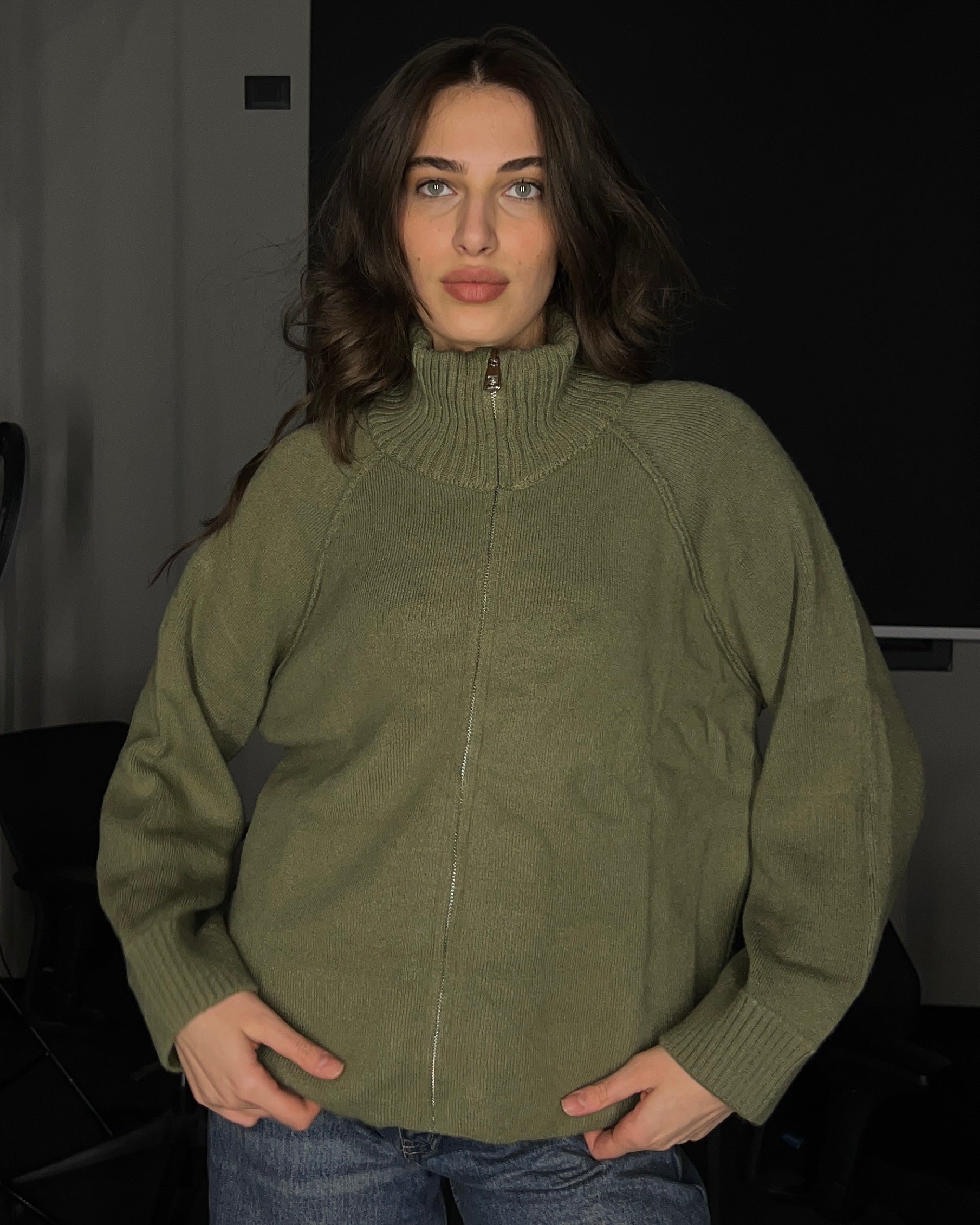 كارديغان بسحاب بلون اخضر بقماش فاخر من مزيج الصوف ناعم الملمس يوفر دفئًا طبيعيًا وتهوية مثالية، مما يجعله مناسبًا لفصول الانتقال أو للارتداء بطبقات في الأجواء الباردة