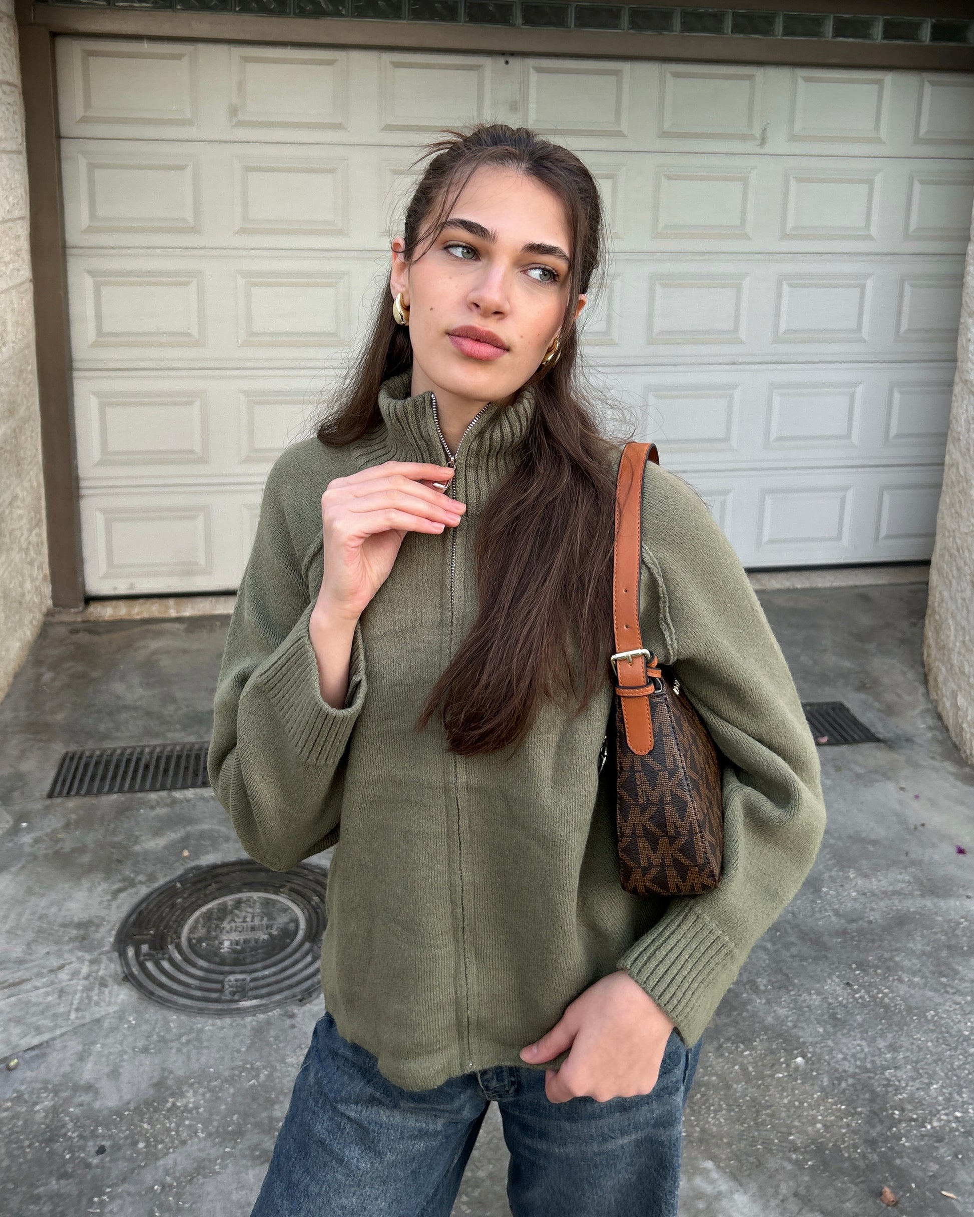 Sage Green Wool-Blend Zip-Up Cardigan with High Ribbed Collar | كارديغان صوف بسحاب باللون الاخضر مع ياقة عالية مضلعة