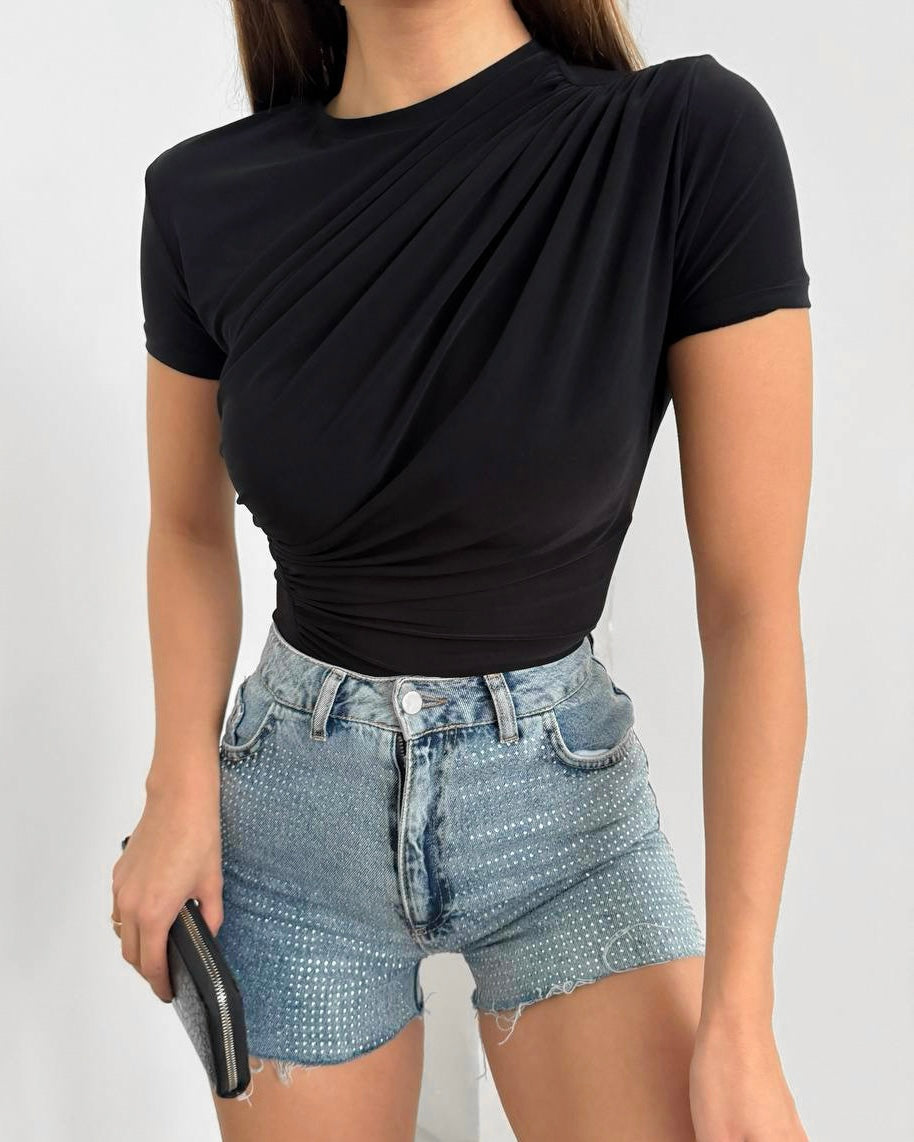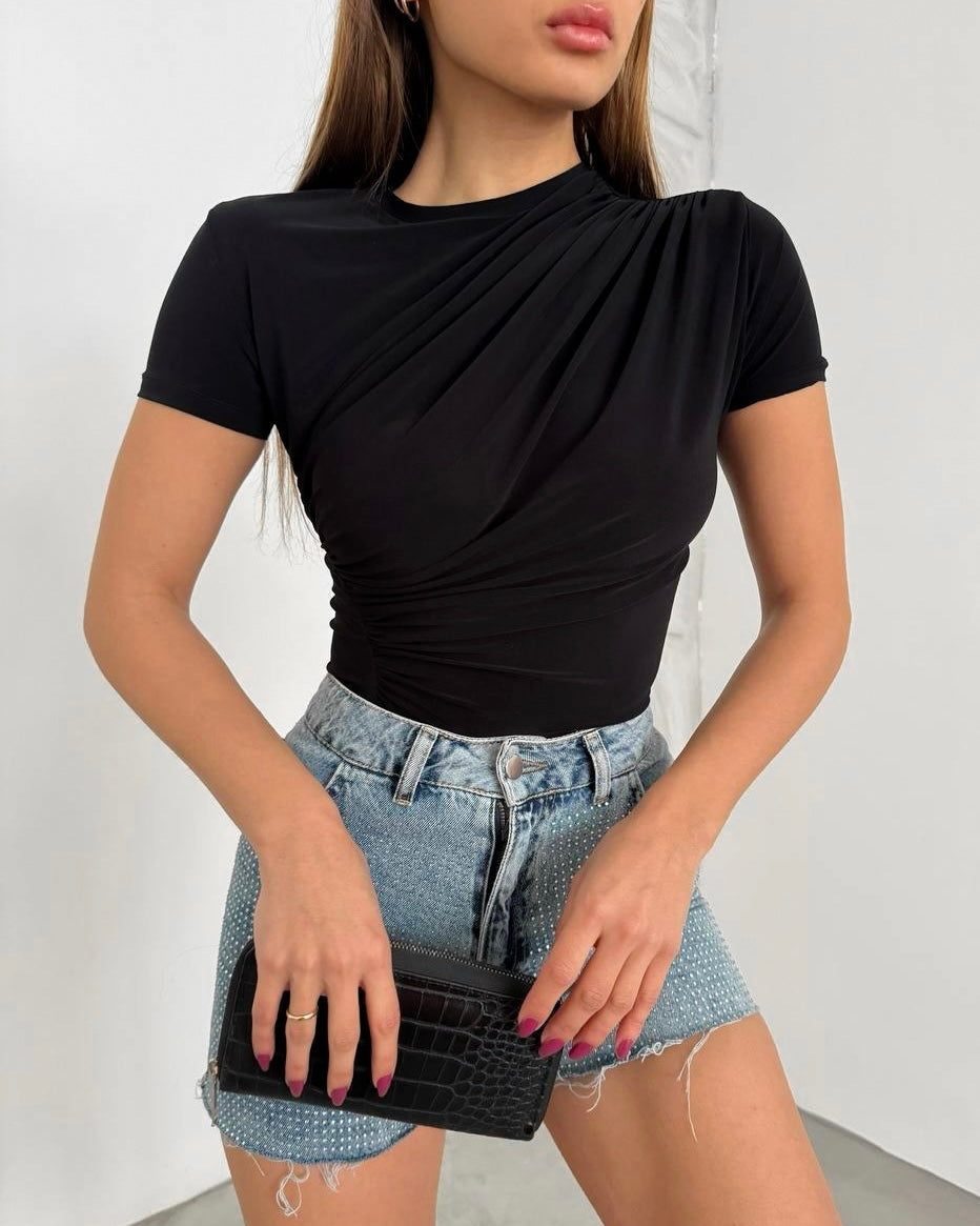 بلوزة سوداء بأكمام قصيرة، تتميز بتصميم فريد حيث يتم تجميع القماش بشكل متموج يضيف لمسة أنيقة ومميزة.