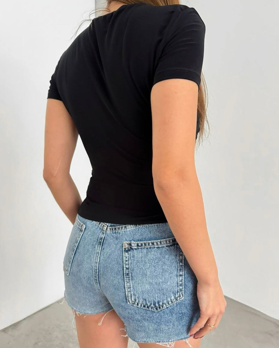 Black Short Sleeve Draped Top | بلوزة سوداء بقصة منسدلة وأنيقة
