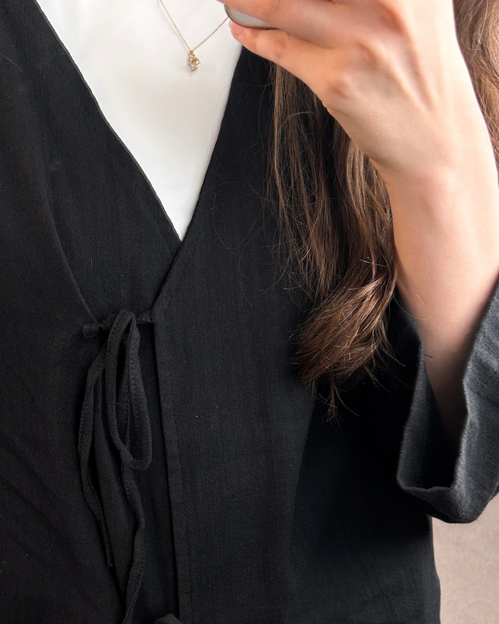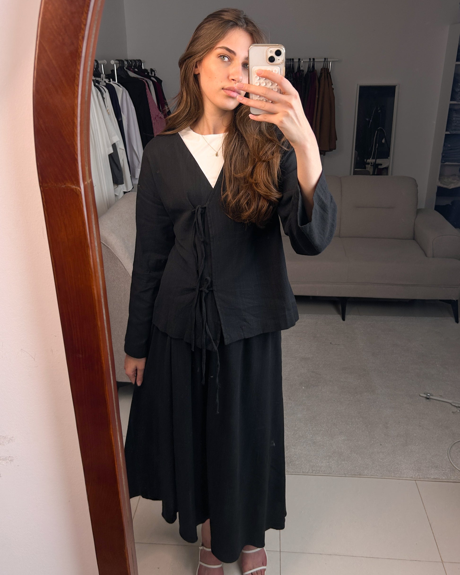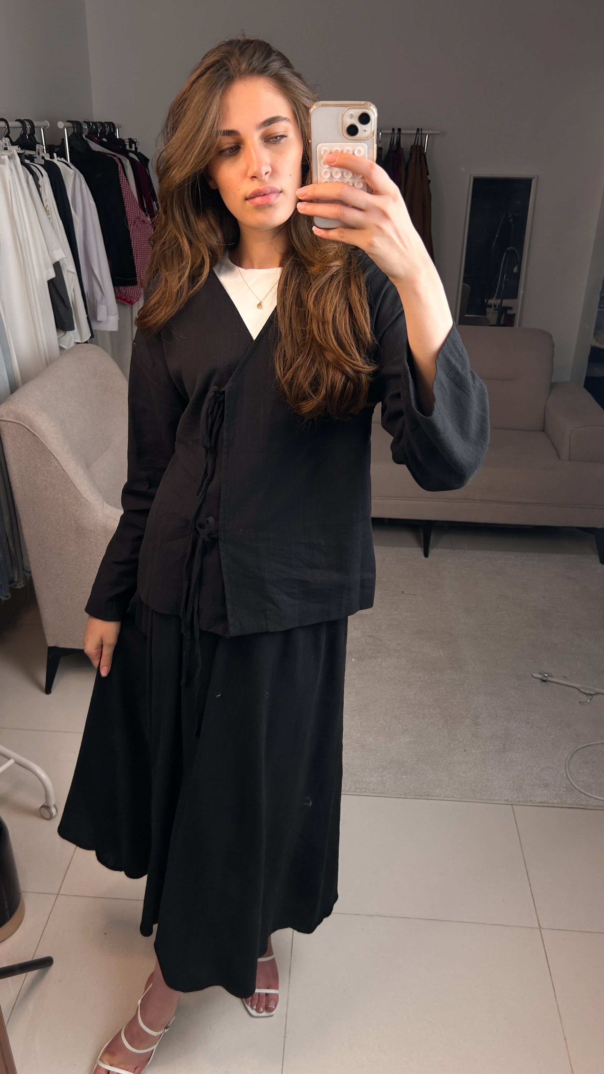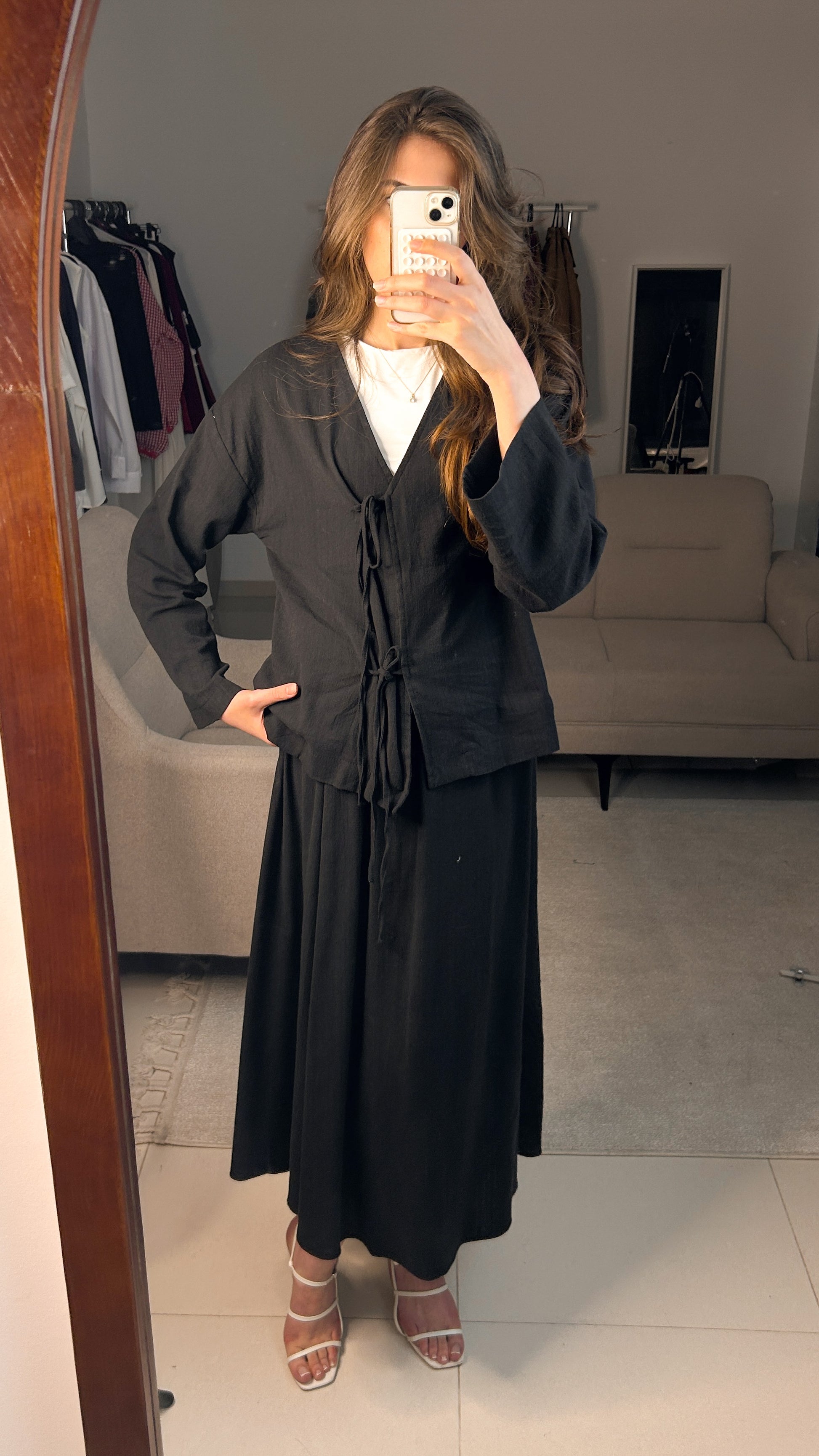 Black Linen Front-Tie Co-Ord Set | طقم كتان اسود بربطات أمامية