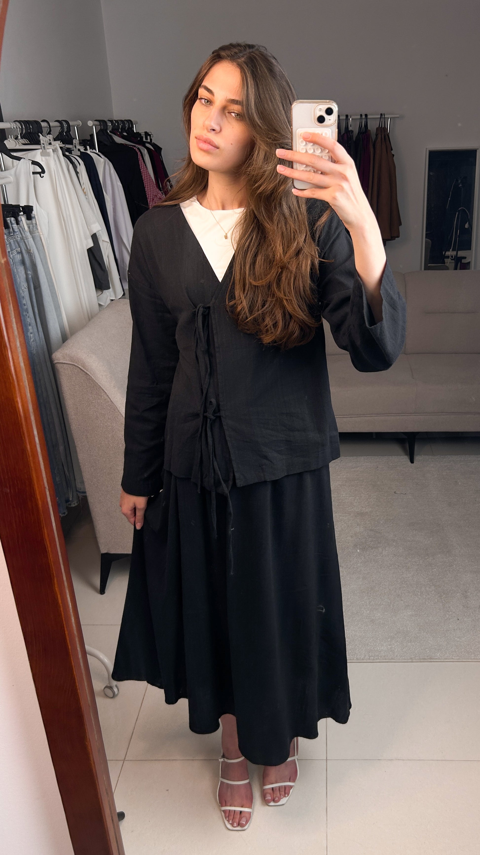 طقم أنيق بلون اسود مصنوع من قماش الكتان الطبيعي الخفيف، يضم بلوزة بتصميم فضفاض مع ربطات أمامية تضيف لمسة أنثوية عصرية، وأكمام واسعة تمنح حرية في الحركة. يأتي مع تنورة طويلة واسعة بانسيابية