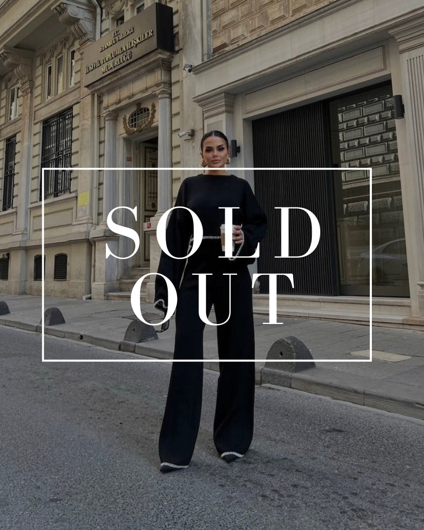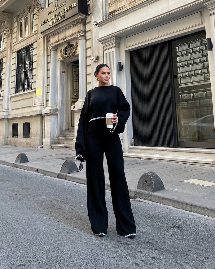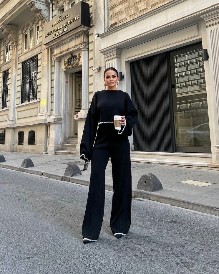 طقم أسود مريح يتميز السويتشيرت بقصة فضفاضة مع أكتاف منسدلة وتفاصيل خطوط بيضاء أنيقة على الحواف