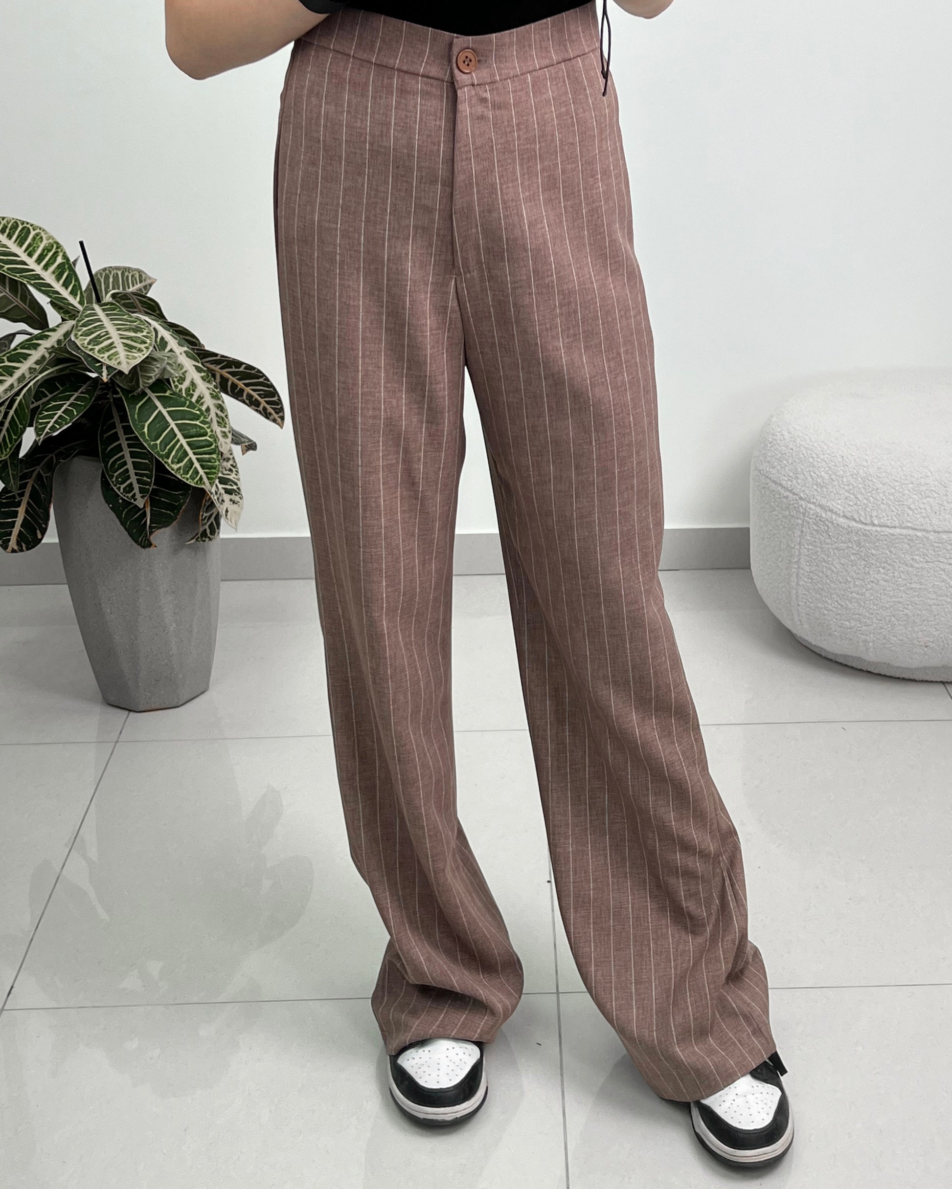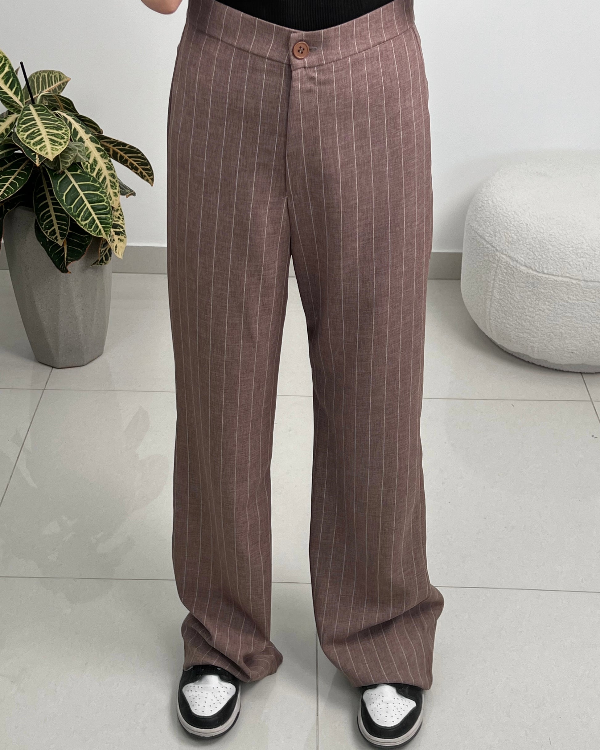 بنطال مخطط مصنوع من قماش عالي الجودة باللون البني الداكن مع خطوط بيضاء رفيعة تمتد بشكل طولي، مما يضفي لمسة أنيقة وكلاسيكية على التصميم. يتميز بقصة واسعة تمنح حرية الحركة وراحة طوال اليوم. مثالي للإطلالات الكاجوال الأنيقة ويمكن تنسيقه بسهولة مع قطع أخرى.