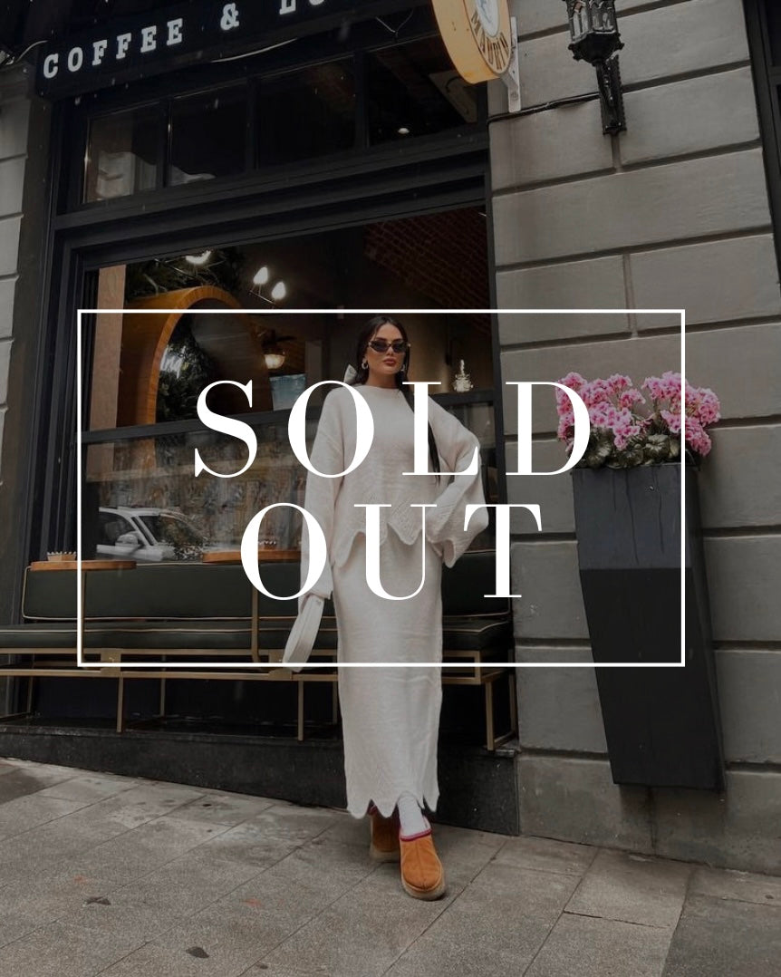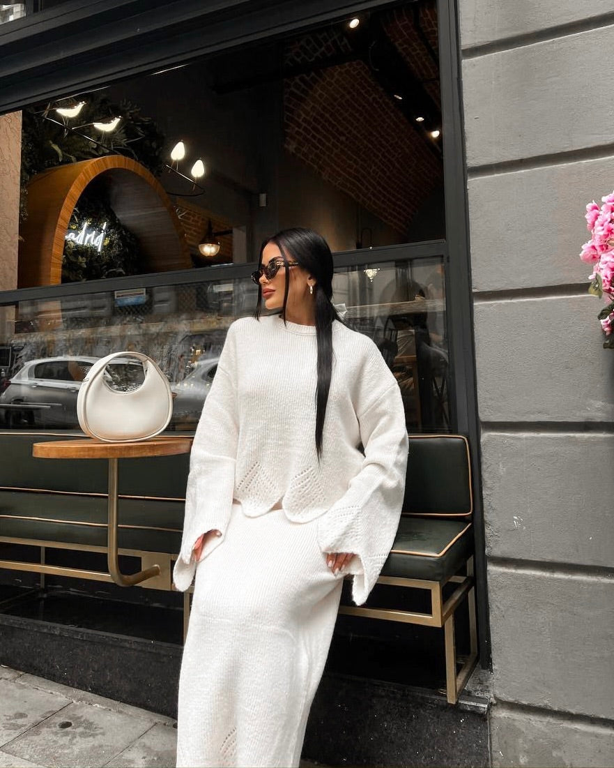 يتكون من سترة صوفية بأكمام طويلة وواسعة، مع حافة سفلية متموجة تضيف لمسة أنثوية ناعمة بتفاصيل محبوكة دقيقة