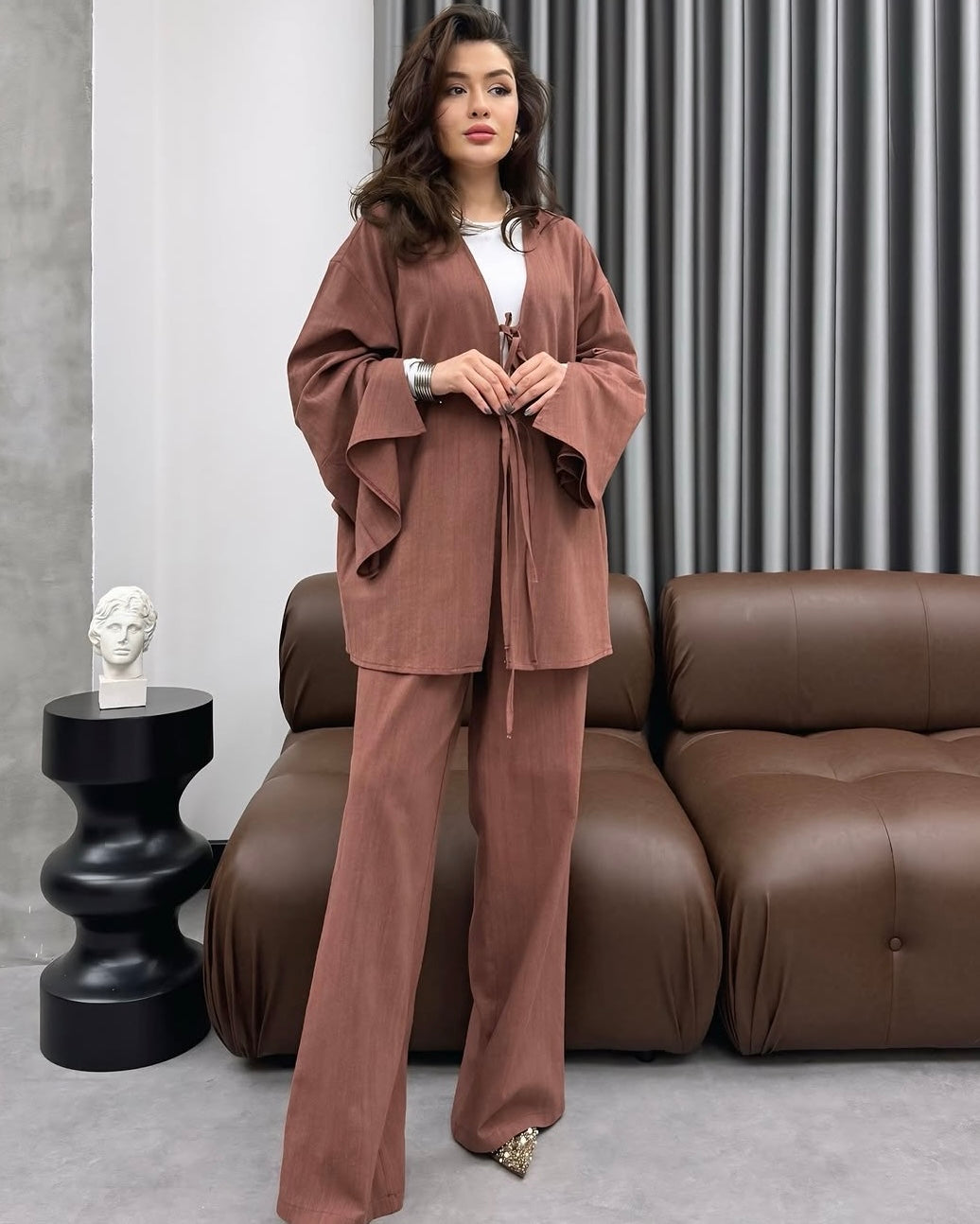الجاكيت بيجي بقصة واسعة مع ربطات امامية ناعمة الأكمام المفتوحة بتعزز الإحساس بالأنوثة والرقي