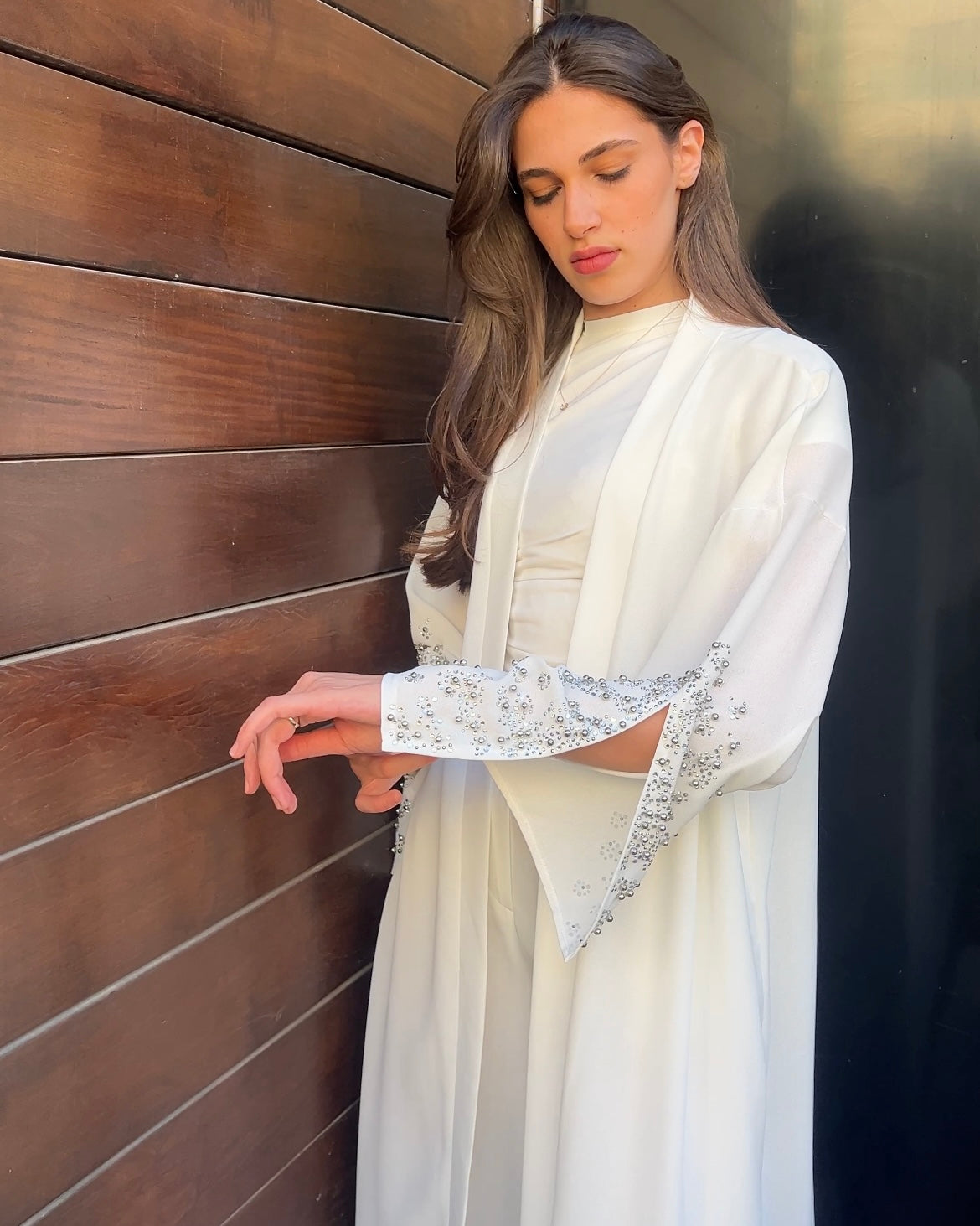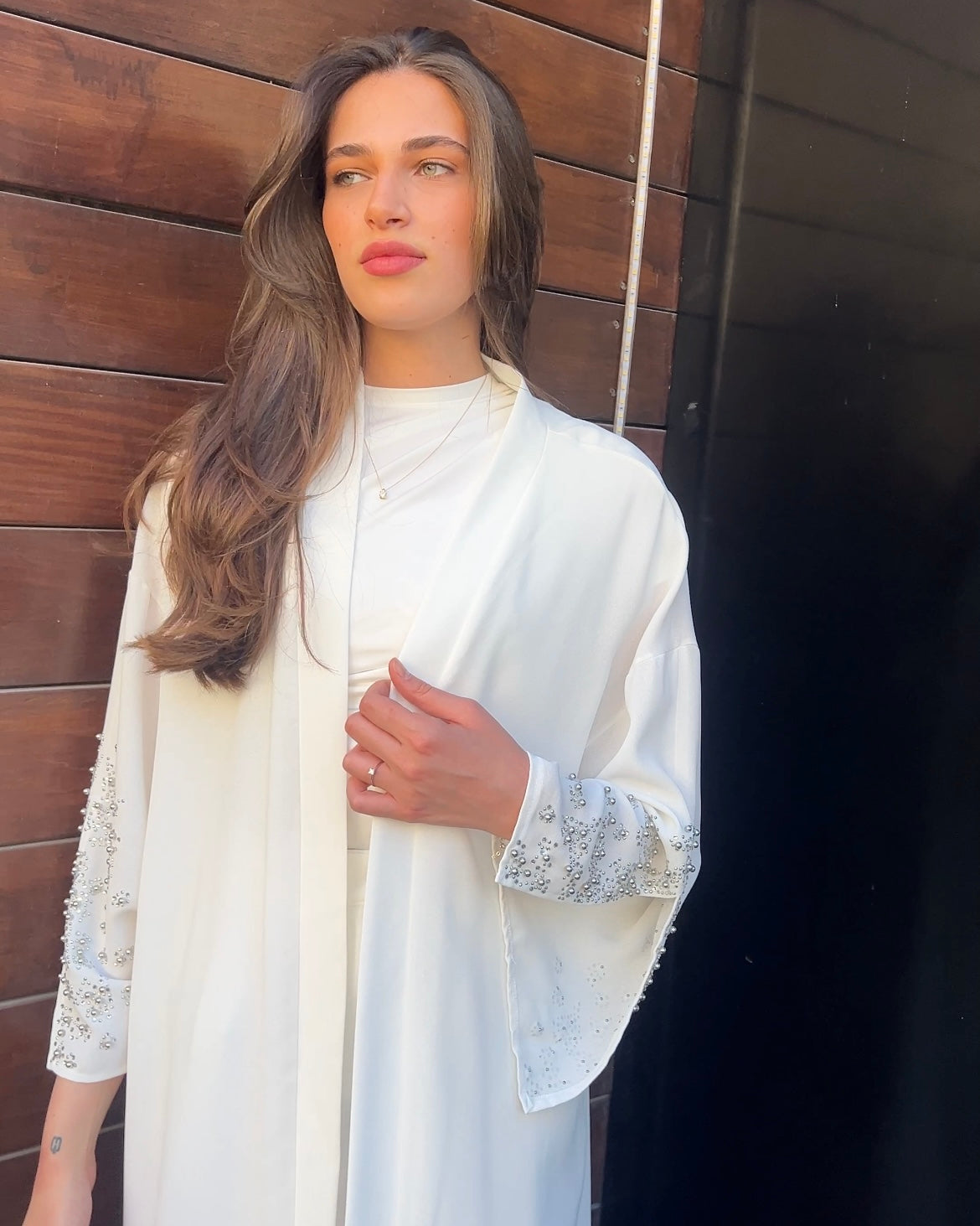 عباية أنيقة باللون الأبيض تتميز بتصميم كلاسيكي فاخر يناسب جميع المناسبات