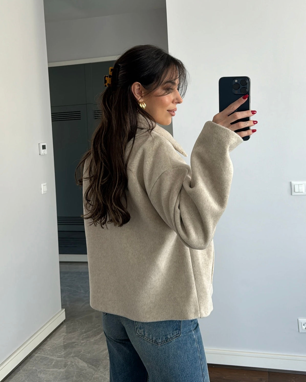 Light Beige Wool Jacket with Zipper and Side Pockets